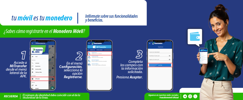 El carnet de identidad a insertar durante la operación de registro debe coincidir con el del titular de la línea móvil a la que se asocia el monedero. Puedes tener un monedero por cada línea móvil habilitada a tu nombre. Los menores de edad también pueden hacer uso de él, bajo la responsabilidad del adulto titular de la línea.